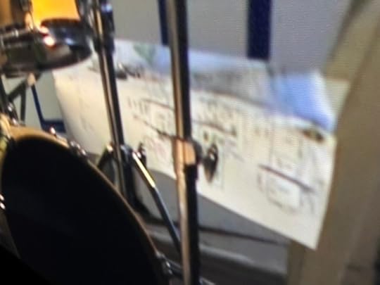 This time around, I focused on the drummer, Þorvaldur Gröndal, and I noticed something I hadn’t before, something that at first looked like sheet music or a page from a notebook. It was resting on a chair near Gröndal’s drum set. This is a close-up:
