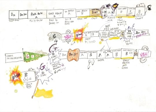 A lot is revealed in this document, which is essentially a score in the form of graphic notation. For example, there are the two “búmm” (or “bomb”) markers when the cannons go off, and there are the spots labeled “Neu!” in a way that nods to the covers of albums by the great German band of that name.