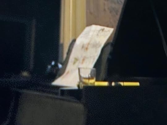 I confirmed after I left the exhibit that the drummer’s sheet and this image were the same. Gröndal’s version does seem to have been marked up, with thick vertical lines identifying several junctures. It also appears that at least two other musicians had these same charts in plain view. Here are details from each of the two pianists’ screens: