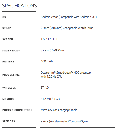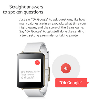 The above image is from the initial promotional material for the Android-powered LG G Watch. It is showing support for “Ok Google,” which listens for that phrase as a prompt. Of course, in order to do that, the watch has to be always listening. As useful as the concierge-ish search is, of all gadgets a watch needn’t have to listen — you could just, you know, hit a button. Also from the promotional language: “It doesn’t just listen well, it communicates with you well: straight answers to spoken questions.” The initial specs don’t seem to note the inclusion of a microphone.