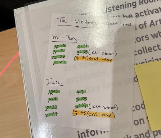 The document lists the show times for Ragnar Kjartansson’s installation The Visitors, which has been exhibited at the San Francisco Museum of Modern Art for the last few years. (At some point in the past, I was asking the ticket salesperson at the museum when the next showing was, and she pulled out this sheet. With her approval, I took this quick shot of it.)