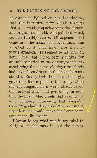Yes, I am enjoying, greatly, Rebecca West’s 1918 novel The Return of the Soldier. I don’t think I’ve read previously a contemporaneous account of what zeppelins sounded like to those for whom an appearance overhead was a not uncommon occurrence. (West is the pen name of the late Dame Cicily Isabel Fairfield. She and H.G. Wells were the parents of author Anthony West.)