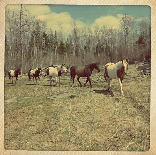 The first photograph shows horses – five of them in a row, each in the same white and brown colour palettes, each with varying degrees of colour and shade. They look orderly and yet somehow wild, like there is a spirit in them that can’t be controlled. The trees behind them are barren and tall, slim naked things that whisper of a long winter nearly over. The grass is yellow and batted down, and beyond the dead trees a few lonely spruces grow, green dark against the white woods. There’s the edge of an old worn fence just to the left, hinting at more that we can’t see. The sky is blue – bluer than it seems like it should be in a photo so leeched of colour, blue with puffy white clouds.