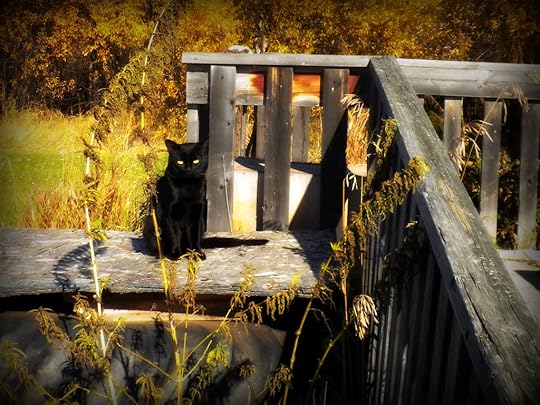 Yesterday my son took me to a little park by his apartment, and I suppose we fed the ducks or some such, but I cannot quite recall. I remember the joint of the porch, the way the wood was still brown in a patch protected from the wind. There was a household cat, you could tell by the lustre of its fur, who took to sitting in the shade of the porch when I would come to visit. It had brilliant golden eyes and the blackest fur you can imagine; blacker far than night, which we all know is shot with colours, stars and planets and now the city lights that never seem to die.