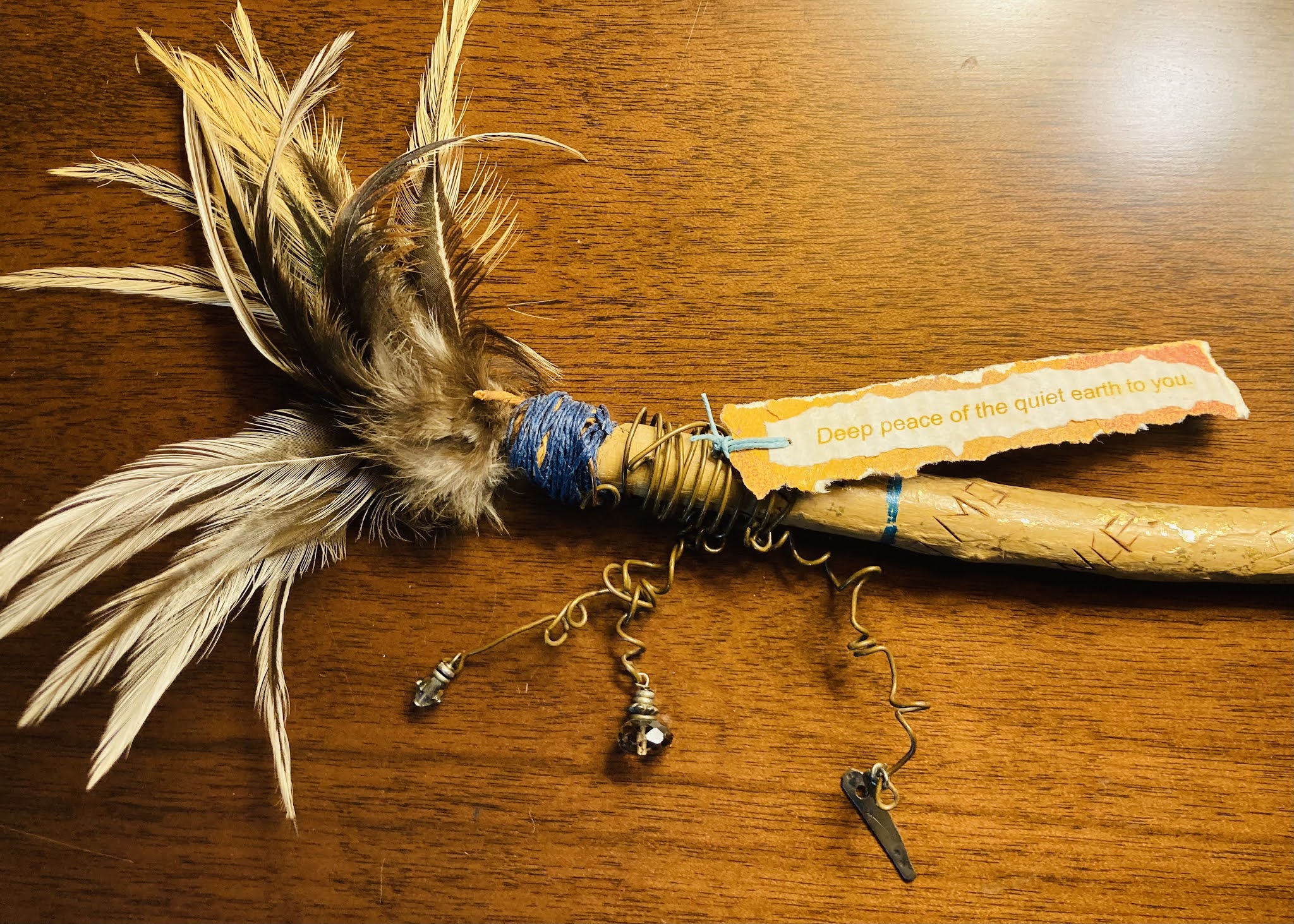 Yesterday, while I was still in the thrall of my bliss, I did my meditation at my studio. After a morning of sorting through my brother's belongings, a parting gift from his former landlord as I left my childhood home to return to my current one, I needed a place to put my feelings of peace and joy and connection. I took with me a stick my brother had started to work into something, the dark one second from the left, along with some deer hide lacing he had wrapped around the stick. Both the stick and lacing reeked of cigarettes that will eventually dissipate, even as they carry the energy of my brother's hands. I put on my new Spotify playlist, and got to work with my drill, the stick beginning to smoke from the friction of the drill bit going deep until it emerged on the other side and I thought of my deep joy. I finished with sand colored waxed linen, carefully wrapping it tightly around the surface, imbuing the beautiful beach stick with my wishes for dear Denny: Deep peace of the quiet earth to you.