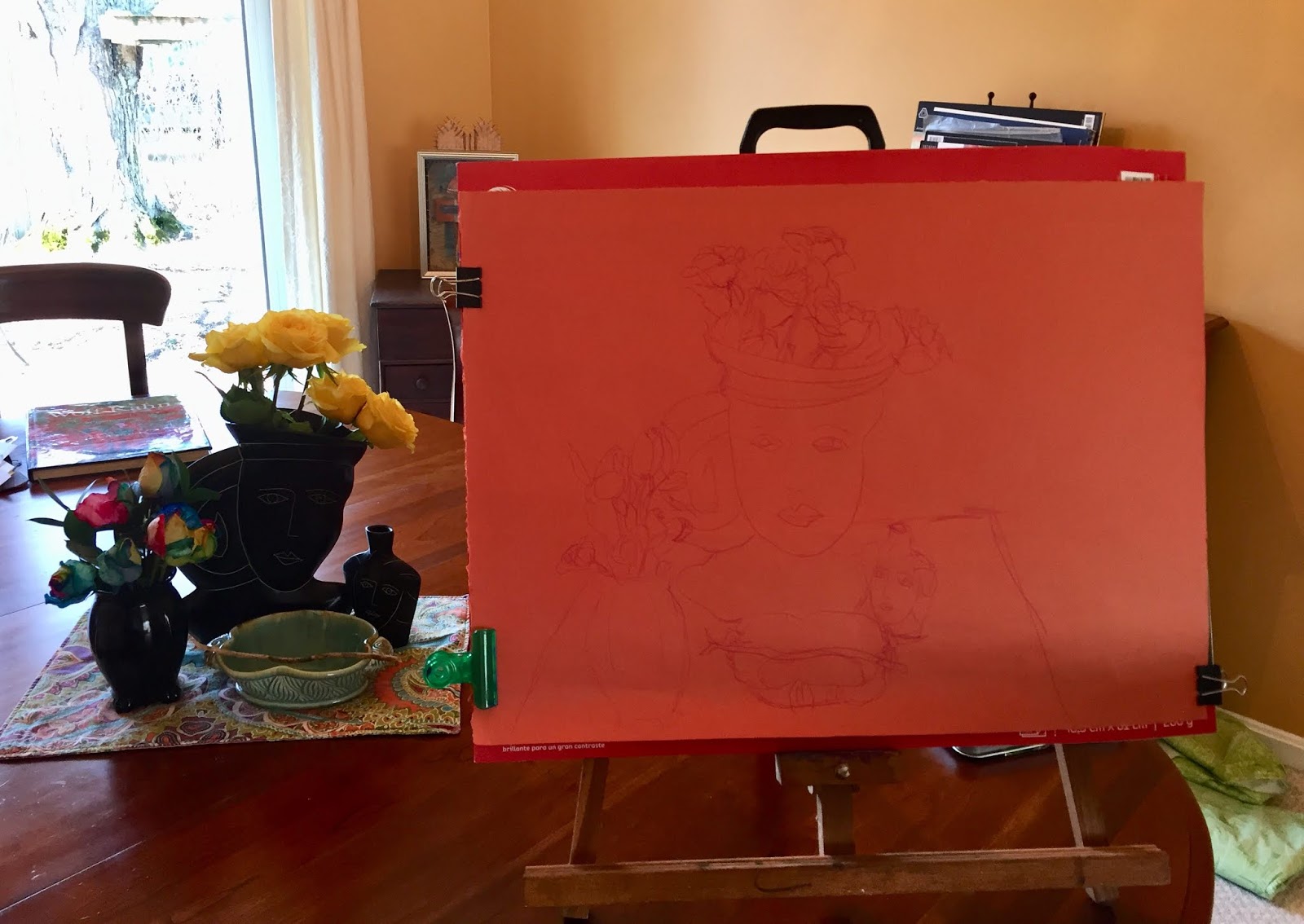 Earlier in the week, I set up a still life after my sweet husband went out for a brief grocery run and brought me some lovely yellow roses from the store. The kaleidoscope roses in the small vase came by mail from my sister, a congratulations gift for the opening of my show way back before we knew we had to Stay at Home.