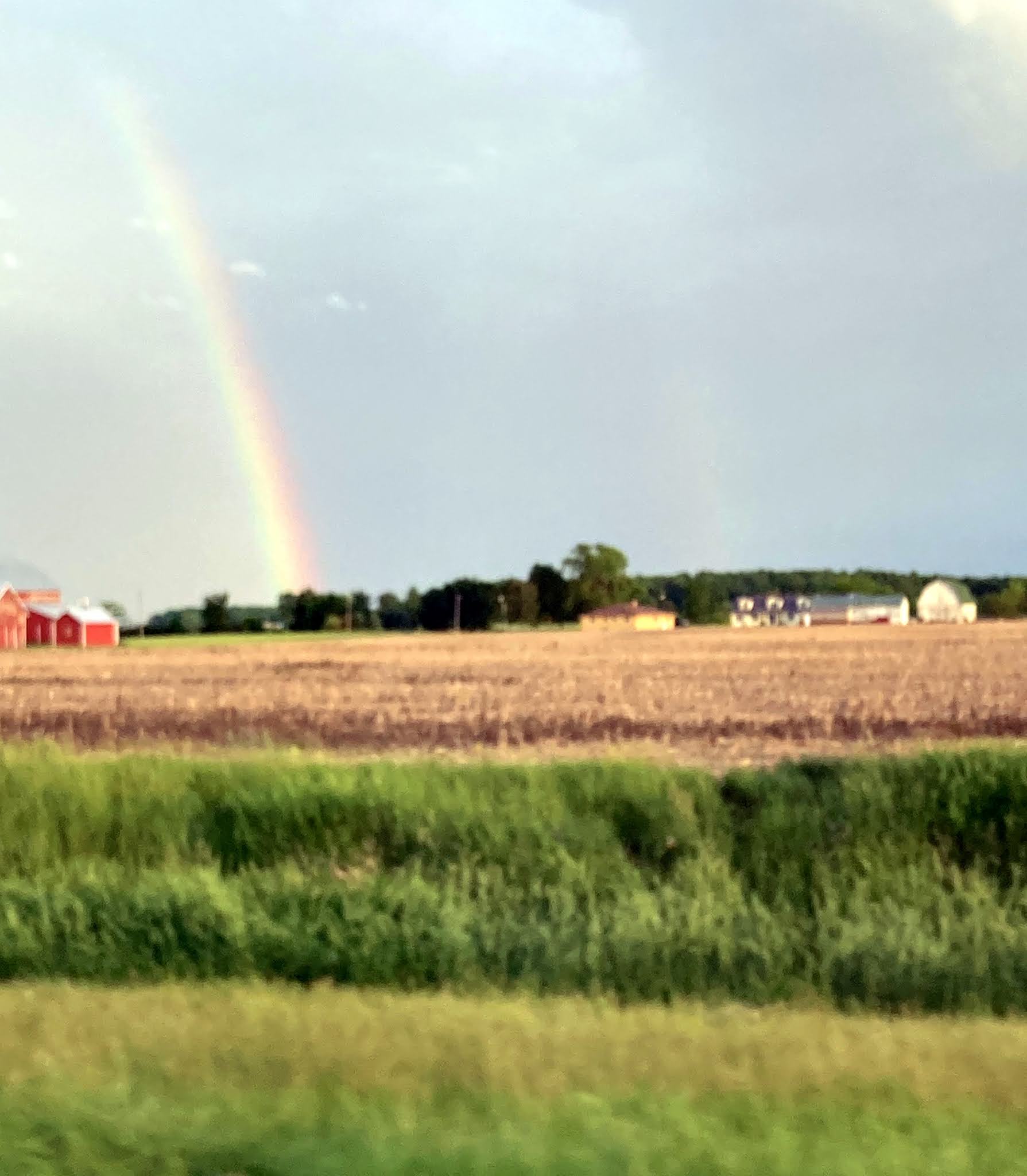 Seeing a double rainbow is a spiritual experience, an auspicious omen of good things ahead. That's how it felt seeing it, the longest-lasting rainbow of any sort that I have ever seen. Barely visible in this snapshot from a moving car, it shimmered in a rainstorm sky for a good twenty-five minutes, sending out its blessings to all who saw it.