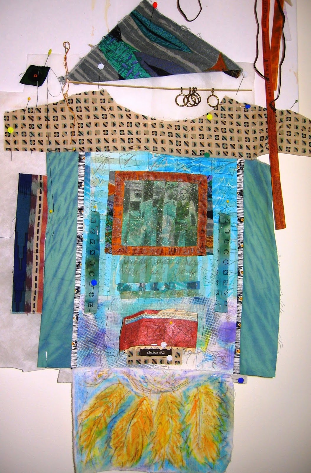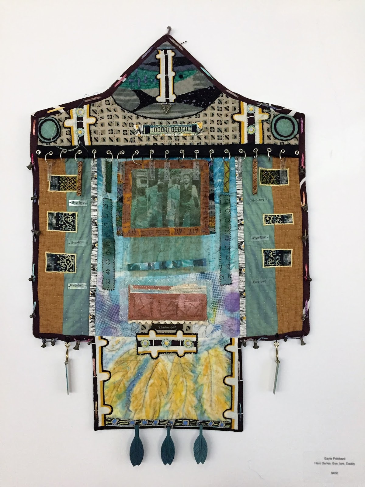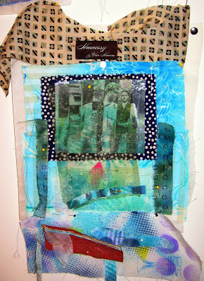 and pieces pulled together to tell the story.Luckily for me, I am an artist. I have a place to put those feelings, to let them birth out of me into the world where I (and other viewers) can contemplate the expression. It wasn't long after Dad died that I started this piece using bits of his clothing, a photo-transfer I made of an old Army picture, rubbings made in Mexico, hand dyed fabrics, and Depression-era ration tickets for food and gas transferred onto fabric. I got to tell my story and begin to heal my soul.