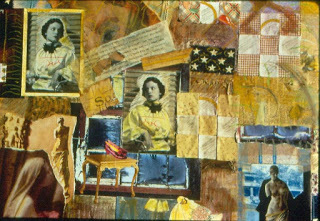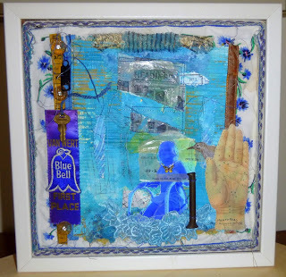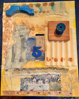 This collage, I call it May Queen, was started back in July in a play-day with my art group. I made several pieces that day, but I really liked this one. I pulled it out this week and finished gluing the three dimensional elements in place. I plan to darken the blue botanical drawing in the bottom right corner, and maybe add a line of nice blue oil pastel, melted to a lip-sticky consistency, along the curve of the woman's back on the left. I think that will do it. The collage was created on stretched canvas, so I will either frame it with found wood pieces, or find a box or frame to pop it into.