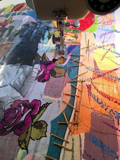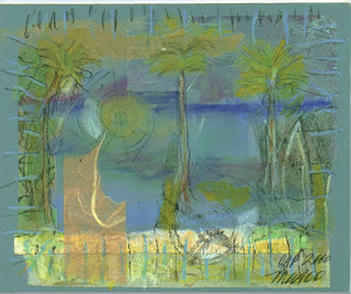 Now that the New Year is well underway, I am happy to have entered back into my art studio routine. This month began with the need to clear off my work space, which always leads to the discovery of some forgotten sketch, background painting, or fabric or collage snippet. I found all of these, and since several were already in progress, still in the thrall of the original idea, I just picked them up to finish them.