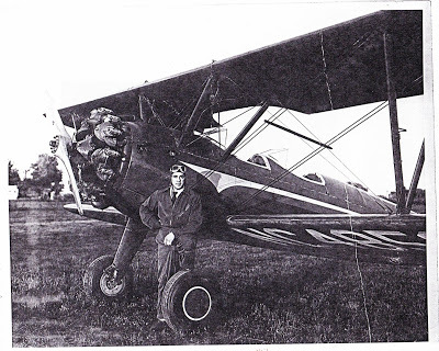 Then I ran across a picture of dad from 1949. It is actually a photocopy of a picture of dad, and I wish I knew who has the original. In the photograph, he is standing next to his biplane. He's wearing a flight suit and, instead of his flashy Army aviation sunglasses, he has flight goggles pushed up onto his leather flying cap.