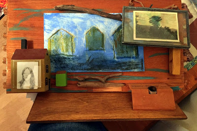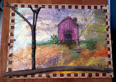 House Drawing #4 isn't finished yet. It is larger, and I am going to mount it on the piece of wood shown. It has also turned into an assemblage, with a shelf at the bottom and found wood, metal and glass pieces added. The wood background, salvaged from an old dresser drawer, has oil pastel marks, and I will probably add some more. The house drawing, just started, is also being created on a background prepared with gesso that has been drawn into before being left to dry. When the oil pastels are added to the surface, they can be pushed down into the grooves in the gesso, creating an interesting, textured surface.