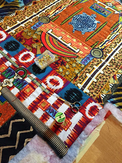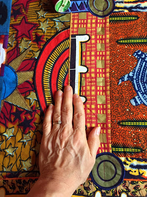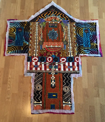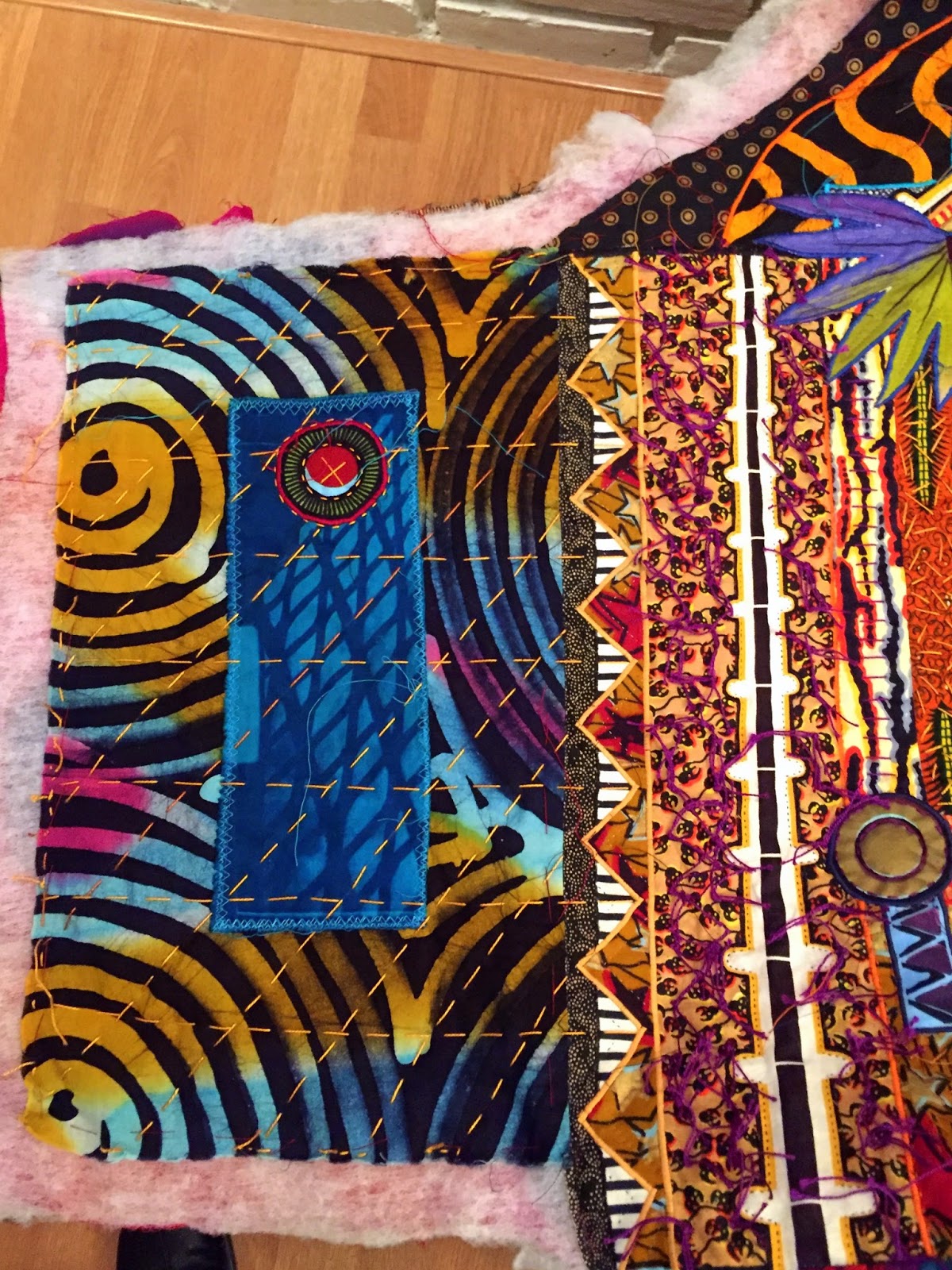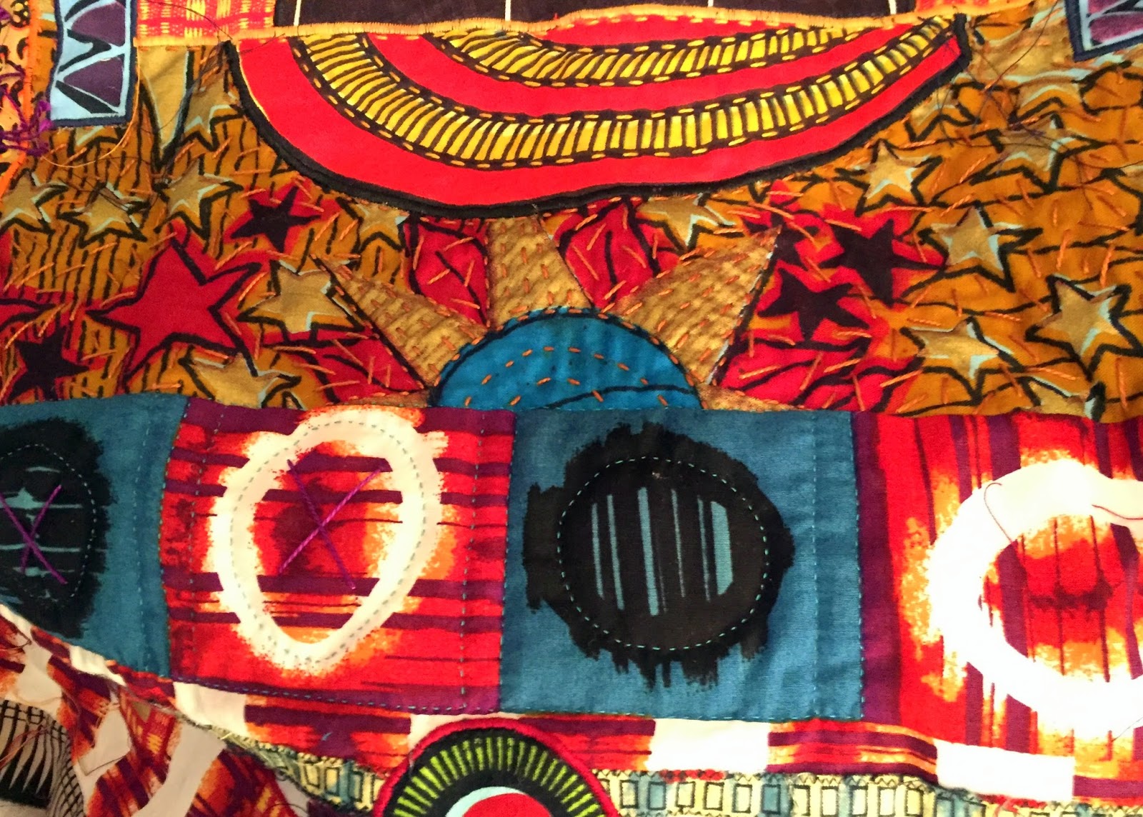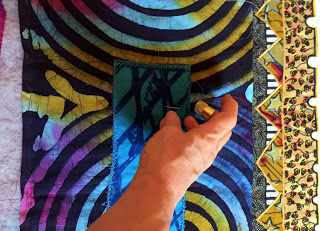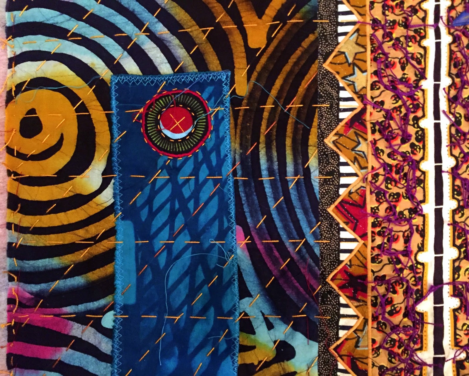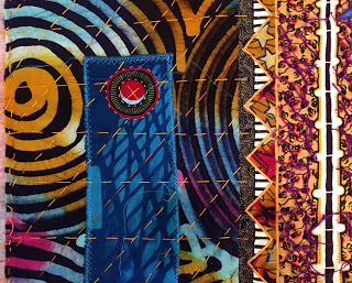 In Turtle Spirit, for example, you can see how the grid formed by the quilted line, executed here by hand with perle cotton and a darning needle, constrasts with the circular pattern of the underlying African fabric used for the side panels.