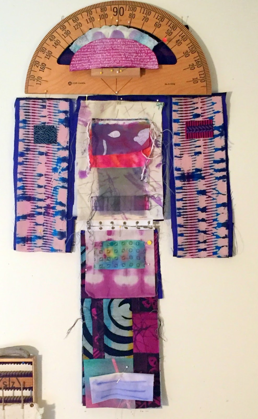 What I'm working on right now? I can't even tell you the titles. For me, I never know exactly what the work is until it reaches a tipping point, and I understand what it is about. I continue working through the uncertainty until the piece reveals its intent to me. I have a number of those in progress right now. One is a political piece that is constructed with my dad's old flag and zippers. More on that another day. I just finished painting the top piece for this one, a construction with several stitched panels and a book at the bottom.