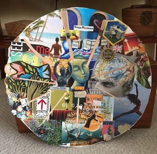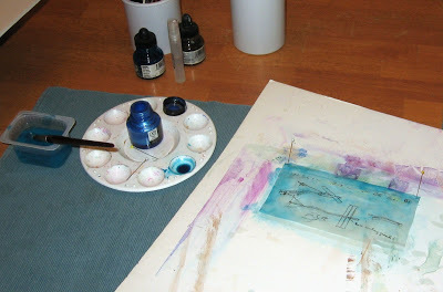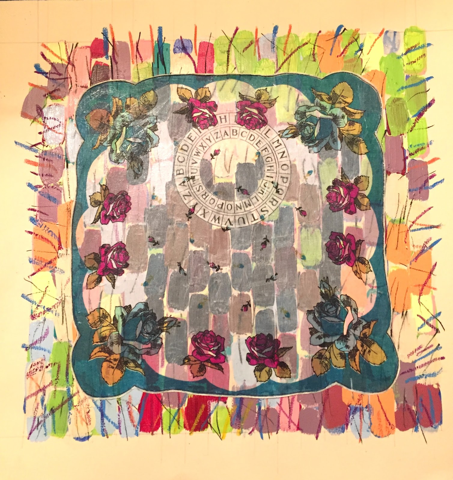 New collage in progress by Gayle Pritchard, 2017Now that our Memories Evoked: Circling Back Home exhibition is over, I am back at work on some new pieces. They are a bit different for me. This is the beginning of a new one, collage and oil pastel markings over painted marks. The antique handkerchief was selected for the color, but also because I knew how cool it would look made transparent with matte medium. I placed the found paper alphabet circle underneath it before gluing it in place, but after I made my marks on top of the paint. I like layers, and hiding some of my marks.