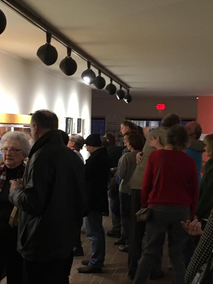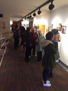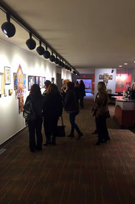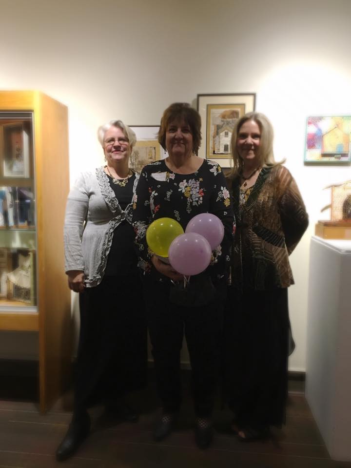 crowd at the entry to the exhibition. The opening reception for Memories Evoked: Circling Back Home was last Saturday night. The gallery staff reported it was the largest attendance for an opening they had seen. Needless to say, Gail, Jill and I were thrilled at the turnout. Having worked for two years to create the exhibition, each of us is delighted to be able to show a large body or our work. There are just over a hundred artworks on display, and each of us have thirty some pieces in the mix. Even we are amazed, not only with the amount of new work we created, but with how beautiful it all looks installed in the gallery.