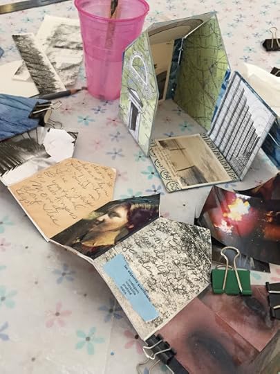 I have just finished Dream House tonight, a handmade book inside of a handmade, hinged house structure based on a dream. Here you see the accordion book part of the piece clipped and clamped for drying.