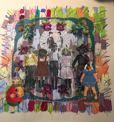 In the newest piece I am finishing, and which I showed in progress in my last blog post, I used found imagery of a group of children, which have now been sandpapered, hand colored with oil pastels and stitched with other found papers. I love how it's turning out!