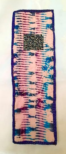 The next step was to add other collage elements, which I will show you next time. After those had dried, I began stitching the edges of the fabric with embroidery floss. I then ran everything that would fit through my sewing machine.