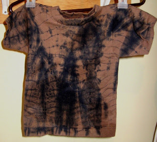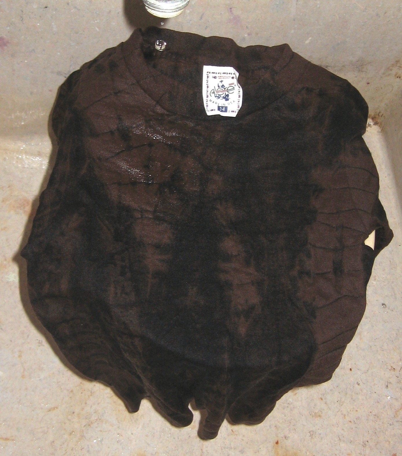 I immediately washed the shirt, then dried it. Here's how it came out. The navy blue design is where my tied string left the original color. The rest of the discharged shirt turned a lovely shade of brown. Love it!