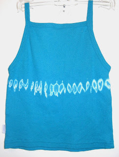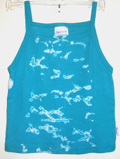 I have posted two pix here of a turquoise t-shirt I had previously discharged, but using only a bleach pen. You can immediately see the difference. In the turquoise shirt, more of the original color remains. That's because I was able to apply the discharge with a bleach pen only on the tied areas of the shirt. Because the shirt was not soaked in discharge solution, only the area where the bleach was applied was discharged.