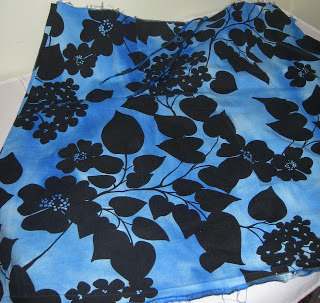 The reds and pinks you see on the left are several types of airbrush inks. Although I like how they look on the white portions, I did not, however, like how the paints looked on the black areas, which is where the problem was, after all. I needed something that would cover the black, darken it, and add color to the white. On the left, you see three different blues painted on. The two on the farthest left were also two different types of airbrush ink, one opaque, and one not. Again, they affected the black areas in an undesirable way. The deeper blue on the far right worked perfectly. I used an azure blue Jacquard Dyna-Flow paint, and it did the trick. I painted it onto dry fabric, but will evenly wet the fabric in the washer, spin it, and paint it damp when I finish the painting. I'll let you know how it turns out!