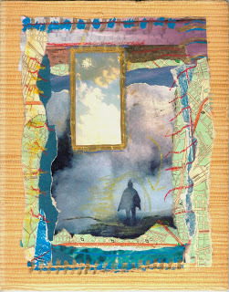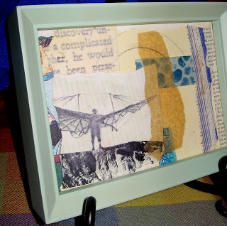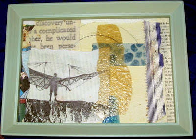 The past several months I have been very busy with a design project for hire, which I can't tell you more about right now! In the meantime, though, here is a small collage I finished recently, Flying Man. It utilizes found paper, photo transfer images, hand printed cyanotype imagery on paper, hand made crystalline paper, all on a nice, heavy weight watercolor paper background. It sold recently, and has been shipped to the buyer, so I wanted to show you a picture of it while it was on my mind.