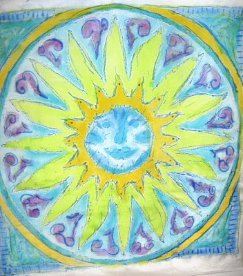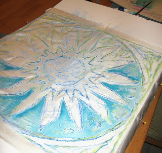 the very fluid paint from spreading into other areas. To start painting, I stretched the silk rubbing with pins onto a large piece of foam core. I'm not quite finished with the painting, but almost. I plan to add some more layers of color in the center, right on top of the Sun's face. Here is what I have so far: