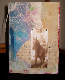 In my last post, I showed you a silk rubbing from Mexico I had found while reorganizing my space. Here is another unfinished piece I found, a class sample of a black and white photo transfer on silk. I decided to make it into a collage, but I needed to paint it first, so that the bright white of the silk would blend in more with the cyanotype-printed fabric I wanted to use with it.