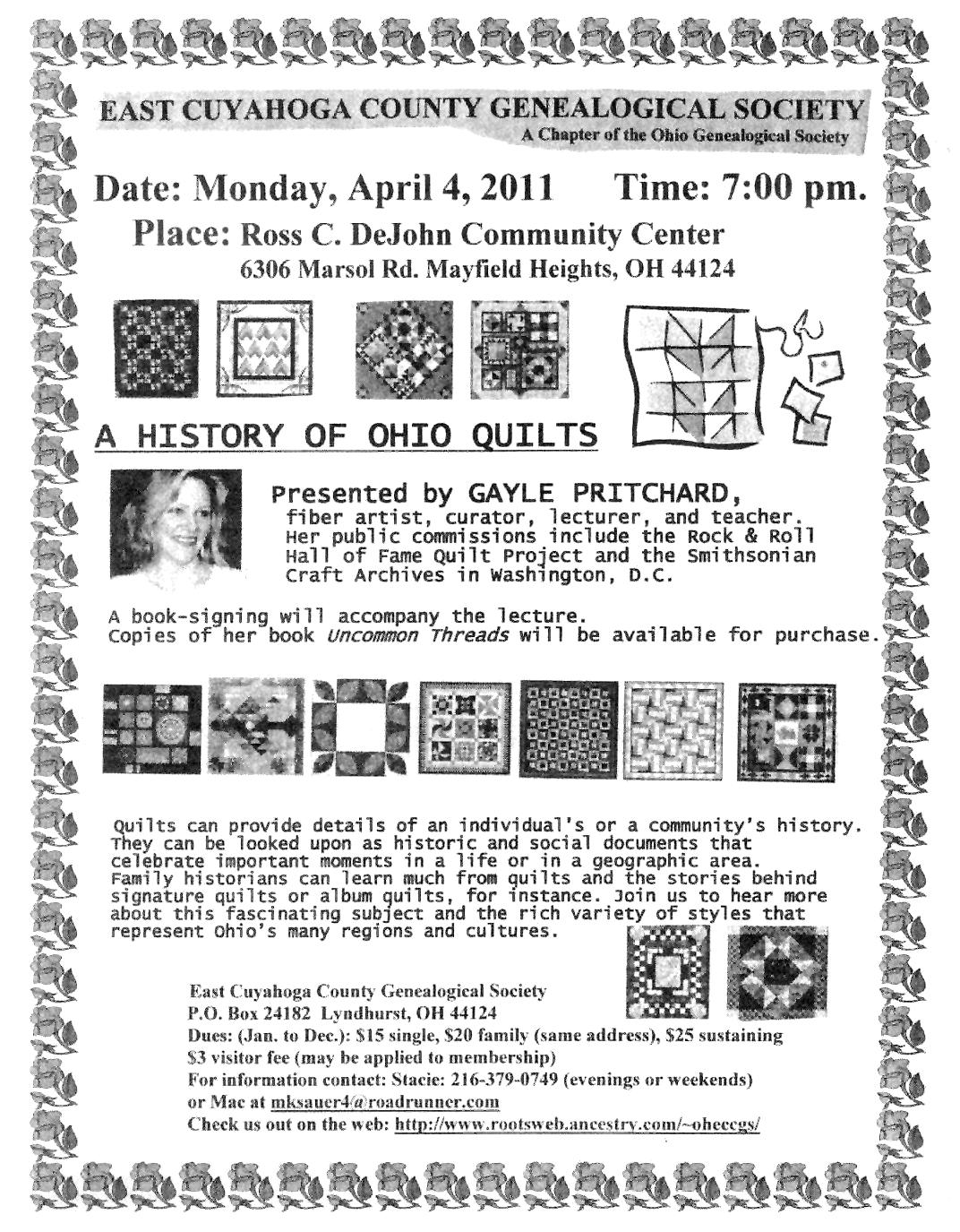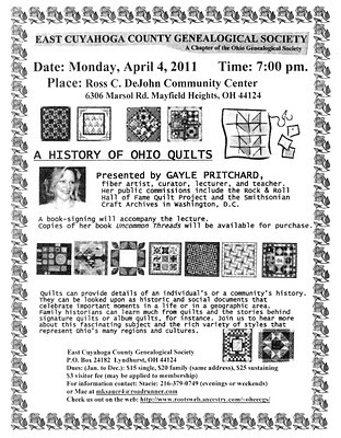 I had a great time when I made my presentation to the East Cuyahoga Genealogical Society last month. Tomorrow night, I will be presenting a lecture and book signing for the Willoughby Hills Quilt Guild. On May 19th, I will be in Medina for a lecture at the public library, and June 23 at the Akron Art Museum. I am so pleased that interest in my book continues, and love having the opportunity to speak with large groups about the amazing treasure trove of fiber art that exists in Ohio.