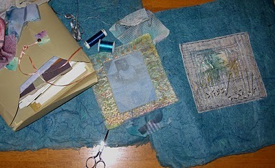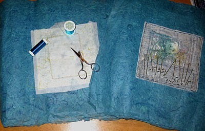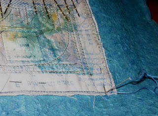 That is exactly where these new collages came from: the back of my travel portfolio. These are two same-sized pieces of raw canvas which I have built collages on the surface of, beginning with journal writing. That was covered with drawing and image transfers, then layers of sheers fabrics and papers, even metal screening, were added on top. I want to mount them onto pre-stretched canvas, but first I have cut some beautiful unryu paper to stitch them onto.