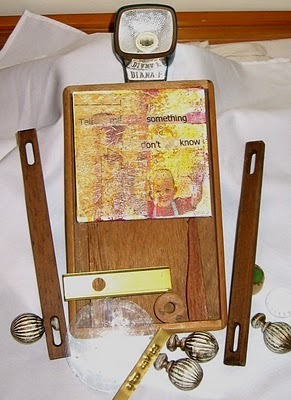 My piece on the postcard here, I Hear Voices, was made about my husband, and was inspired by one of his songs. The piece utilizes the song lyrics, and imagery from his childhood. The unfinished work I pulled out last week, and shown below, was a small collage I made after I Hear Voices. It is also about my husband, and uses the song lyric Tell Me Something I Don't Know. Now I just need to complete the assemblage. Here it is still in progress.