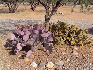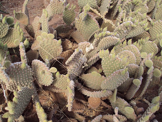 I took a whack at the bunny ears cactus a few weeks ago. It's a low growing cactus and the paddles have fuzzy, cottony looking tiny thorns. Unfortunately for me, I was wearing shorts when the wind kicked up and those cottony looking thorns blew onto my legs as I sliced back the little ears. Not fun. Of course, I should have been wearing jeans, but it was a nice day. That particular plant was trimmed back nonetheless and is now growing within its assigned boundaries.