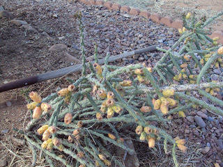 Painful Pencil ChollaYellow pods are its fruit. Fuchsia pink blooms will come soon.