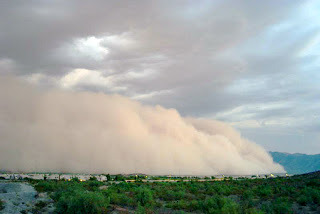 Dust DevilLarger dust storms or haboobs occur regularly toward Phoenix, especially on the I-10. They're as dangerous as a blizzard, and maybe more so because people don't know how to drive in such severe conditions here. There have been many multi-vehicle pileups on the I-10 that have cost more than a few lives. Dust causes zero visibility just like snow, so if you see it coming, discretion is called for. Get off at the nearest exit, find a restaurant, and sit a spell. It beats getting creamed in the constant flow of truck traffic.We most often experience dust devils which are mini tornadoes. They plow through your yard and rearrange patio furniture, garbage cans, and tear your roses apart. I've been caught in a couple and ended up with grit everywhere. A shower is immediately in order. They're not nearly as powerful as a tornado, but they are a nuisance. Because of the air heating up and the dry conditions, these whirling dirt throwers show up until the monsoons hit. When we actually have some humidity, the devils disappear.