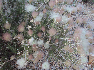 Relocation did wonders for the Apache Plume bush which now is covered with fluffy pinkish plumes and white flowers. It was basically in the same spot as the Bird of Paradise, looking glum and unmotivated. Now in the courtyard, it's been revitalized.