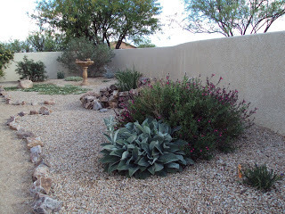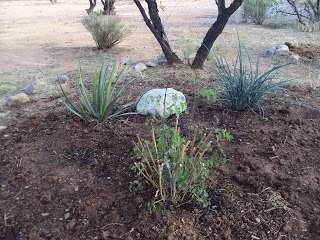 Courtyard ViewOne of the problems with caliche is that it's so hard, roots can't get past it to really establish themselves. It's common in arid areas - and thus we are dubiously blessed with it all over our yard. However, my red-headed Scotsman won't be thwarted. He stubbornly picks away at it whenever there's new planting to do with shovel, pickax, and his iron bar. Our gardens do look quite nice right now, and all that effort over the years has paid off. We'll see how it goes with the little bush.