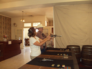Shooting some paintball bulletsLuxury was the name of the game in the 1880s, and goods of all sorts were brought in by train from Europe, California, and the East coast. You could have the finest champagne and fresh oysters at the hotel. If you had enough cash, you might get a seat at the table for the poker games that ran continuously at the Bird Cage Theater, 24/7/365 for eight years, five months, and three days. It is said that over $10,000,000 exchanged hands at the table where Doc Holliday, Diamond Jim, George Hearst, and many others played cards. The Bird Cage Theater houses many pieces of history in its basement today. A hearse made in Rochester, NY trimmed out in 24K gold is one of interest. The hearse's most famous passengers were the Clantons killed in the OK Corral gunfight. Its value is estimated at $1 million.