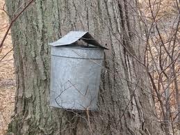 If you were a kid back in the 60s or earlier the sight of tin roof covered buckets on sugar maples was a common sight during February in Western New York. I remember a local family who borrowed trees to collect the thin, clear sap that would eventually turn into sweet amber syrup. A big farm wagon and tractor would pull up to the neighborhood (a rural dairy farming neighborhood) loaded with buckets and taps or spiles. A mallet quickly drove the metal spile into the tree and bucket would then be hung to collect a steady drip of maple sap. Big maples usually had two or three buckets dangling from their trunks. Sap was collected every day and poured into the old-fashioned metal milk cans. It was back breaking work for 4-6 weeks. That was just the beginning. The boiling off process takes hours and constant care before it's ready for pancakes.