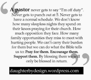 3. Support your pastor. By this I mean show up if you've volunteered for a workday, or to teach, usher, serve in the nursery. Don't be the person who "forgets" the commitment, or calls his cell phone 15 minutes before a service to say you won't be there because you have a hangnail. Be quick to speak positively and steer conversation away from a sermon critique at church, and in the car on the way home. Both my grandfathers were pastors and one wryly commented that most parishioners had roast preacher for Sunday dinner. Don't let that be the entree at your table.