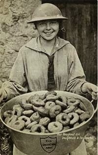 There is a sweet story about The Salvation Army and doughnuts. During World War I, two female Salvation Army officers got the idea of making doughnuts for our soldiers who were on the front lines in France. These women and approximately 250 other Salvation Army volunteers were there assisting these soldiers in 1917. To boost morale, the women decided that some home cooking might do the trick. After considering how they would do that with limited food supplies and equipment, doughnuts were selected. They actually fried them in helmets and thus began a daily ritual of the "Doughnut Lassies" delivering this taste of home right to the soldiers in the trenches. Now you know where the term "doughboy" comes from--it wasn't from Pillsbury. The tradition continued during World War II and The Salvation Army celebrates a National Doughnut Day in June.