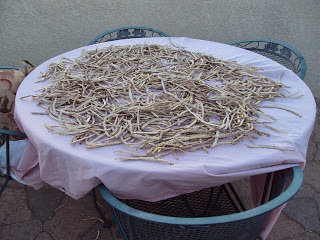 3. We dried them in the sun to get every bit of moisture out of them over a period of a few days. There are bugs who bore into the pods, so you keep the buckets of pods outside. If you take them in too soon, you'll have a buggy house. The pods are really dry when they snap easily in half. If you want to kill off all of the bugs, spread the pods on baking sheets and bake at 175 degrees for an hour or two. We decided that drying and sorting over several days got rid of the majority of bugs. A little extra fiber never hurt anyone.