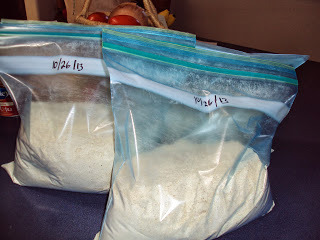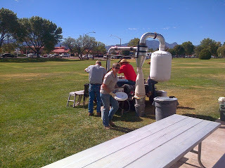 The farmers market had a line of folks waiting to have their pods ground into flour, but the wait was worth it. Each year, mesquite milling gets more popular. A lot of time is spent in the final sorting by market volunteers, who are looking for things that shouldn't go through the milling machine, like rocks, sticks, moldy pods, etc. Our little harvest yielded a little over seven pounds of beautiful mesquite flour from seven gallons of pods. I'll be experimenting with pancakes, breads and maybe some cookies. Substituting a small portion of regular flour with mesquite seems to be the way to adapt recipes. So, a recipe that calls for a cup of flour adjusts out to 3/4 of a cup of all-purpose flour and 1/4 cup of mesquite. The flour is sweet and nutty. It's actually a bit sticky, attesting to the sweet pods from our trees.