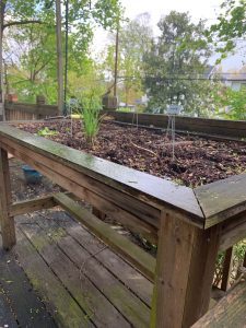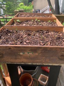I hope to harvest something for our family; therefore, most of our vegetable and herb plantings are on an elevated, gated deck just off our kitchen. This is the same location of the tabletop vegetable garden, and various pots of struggling tomatoes. And something new—dresser drawer garden. It’s just like it sounds. We drilled holes in the bottoms of the boxes for drainage, filled them, and put them on a granite workbench.