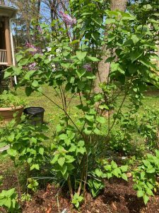 The oriole was sitting on the branch of the lilac that I’ve considered removing because it grew horizontally rather than upward. Now I realize the handicapped lilac make the perfect perch for this bird to watch over the garden. Did he realize the awkward human was planting something that would make exquisite dining for him in the next months?