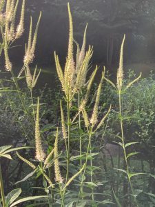 Pictured at the top of my blogpost is a native plant to the Maryland-Delaware-Virginia area; it’s called veronicastrum virginatum and is more commonly known as Culver’s Root. Already it’s almost five feet tall, with flowery stems set up like a candelabra. I’m thrilled this one huge clump of vv has become Studio 54 for native bees, all shapes and sizes.