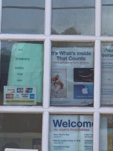 I wave when I see Tom, our wonderful neighborhood postal carrier, faithfully walking his route with a mask during these hot months. Occasionally, he has nothing but advertising circulars to dispense to the block, because the delivery truck containing letters and packages never showed up that day. And imagine having a neighborhood post office with zero stamps in its inventory!