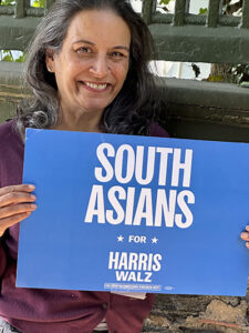 There are certainly conservative South Asian voters who support Trump, but the majority of South Asian voters lean Democratic. Kamala Harris has both Jamaican ancestry from her father, and Tamil ancestry from her late mother, who was born in India. The name Kamala is Sanskrit for lotus flower. I bought a catchy LOTUS FOR POTUS bumper sticker from Impact’s merch table, which also had wonderful tee-shirts with expressions like Desis Decide and Kamala Ke Saath (together for Kamala). How important is the South Asian vote in this campaign? Recent articles in The Washington Post and New York Times focus on the nation’s largest and most affluent immigrant population. Close to 400,000 South Asians who are eligible voters live in the swing states.
