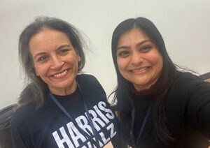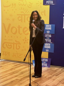 Washington State Congresswoman Pramila Jayapal was on hand to push us into motivation, including the now-famous chant, “We’re Not Going Back.” We heard a moving song performed live by the Broadway composer/singer Ari Afsar, backed by a talented South Asian student a cappella singing group from Penn State. Padma Lakshmi, who celebrates foods and diverse cultures on her Hulu series, “Taste the Nation,” explained why she supports Kamala Harris, and also why she thinks Donald Trump is so dangerous for the country.