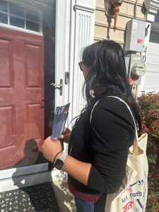 Montgomery Mall seemed to have few visitors on a Sunday morning, just like many enclosed malls around the country today. The Harris-Walz campaign had rented a storefront for its purposes. This former shop was filled with volunteers, signs and totebags. I signed in and was off to sit at a table where a kindly man was giving a hands-on Minivan tutorial. Just what I needed. I also breathed easier when another volunteer appeared and said she’d be glad to partner with me while door-knocking. My partner was a lovely woman who had Minivan down cold without needing instruction. She also was a Perveen Mistry reader. What were the chances?